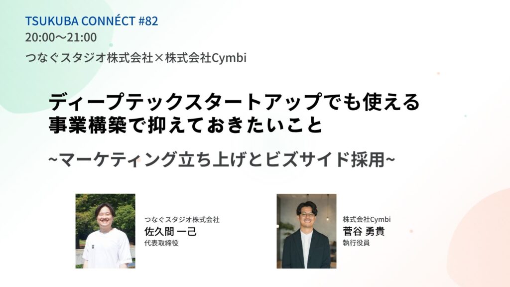 登壇者は、リクルート、ユーザベース、スタートアップ役員を経て地方企業・スタートアップ向けマーケティング支援を行うつなぐスタジオ株式会社 佐久間と、スタートアップで事業責任者を歴任し、現在は採用支援企業の執行役員を務めるCymbi 菅谷です。
